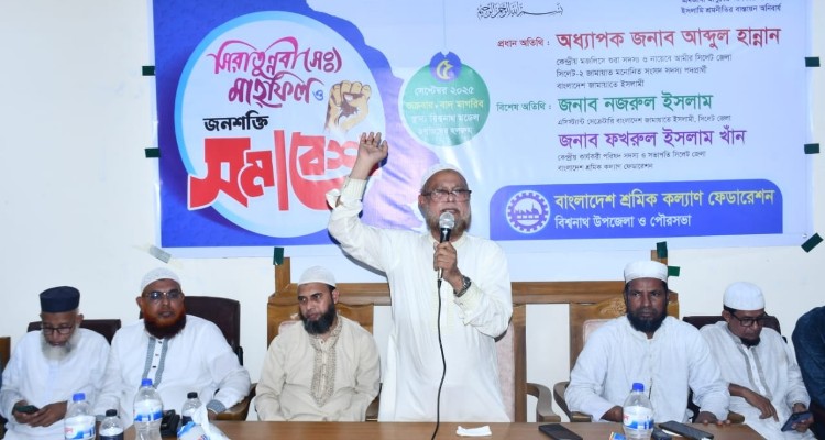 বাংলাদেশ জামায়াতে ইসলামীর কেন্দ্রীয় মজলিশে শুরা সদস্য সিলেট জেলা জামায়াতের নায়েবে আমীর ও সিলেট-২ আসনের জামায়াত মনোনীত সংসদ সদস্য পদপ্রার্থী অধ্যাপক আব্দুল হান্নান বলেছেন, ইসলামী আদর্শ বাস্তবায়ন ব্যতিত কোন শ্রেণি পেশার মানুষের অধিকার আদায় করা সম্ভব নয়।বিশেষত শ্রমজীবী ও অধিকার বঞ্চিত মানুষের একমাত্র রক্ষাকবচ ইসলাম। জামায়াতে ইসলামী এদেশে ইসলামী আদর্শ বাস্তবায়নের জন্য লড়াই করেছে।তাদেরকে বিজয়ী করার মাধ্যমে শ্রমজীবী মেহনতী মানুষের অধিকার আদায়ের পথ উন্মুক্ত করতে হবে।তিনি আরো বলেন,ইনসাফ ও ন্যায় ভিত্তিক সমাজ প্রতিষ্ঠা না করতে পারলে রাষ্ট্র তার কাঙ্খিত উন্নয়নে পৌছতে পারবেনা।আগামী নির্বাচনে দেশের মানুষ মার্কা দেখে নয় প্রার্থী দেখে ভোট দেবে।আর সেই নির্বাচনে জামায়াত মনোনীত প্রার্থীরা বিপুল ভোটে বিজয়ী হয়ে আগামীর সরকার গঠন করবে।তিনি গতকাল শুক্রবার সন্ধ্যায় বিশ্বনাথ উপজেলা সদরের মডেল মসজিদে বাংলাদেশ শ্রমিক কল্যাণ ফেডারেশন বিশ্বনাথ উপজেলা ও পৌরসভা শাখার যৌথ উদ্যোগে আয়োজিত সীরাতুন্নবী (সা) ও জনশক্তি সমাবেশে প্রধান অতিথির বক্তব্যে কথাগুলো বলেন।