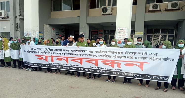 সুনামগঞ্জ ২৫০ শয্যা বিশিষ্ট জেলা সদর হাসপাতালের জরুরি বিভাগে প্রবেশ করে একজন ব্রাদারকে মারধর করার ঘটনায় ২৫০ শয্যা বিশিষ্ট জেলা সদর হাসপাতাল এর কর্মরত সিনিয়র স্টাফ নার্স এর উপর কতিপয় উগ্রবাদী, দুষ্কৃতিকারী ও দাঙ্গাবাজ কতৃক ন্যাক্কারজনক হামলার প্রতিবাদ,অপরাধীদের দৃষ্টান্তমূলক শাস্তি ও দালাল নির্মূলের দাবিতে মানববন্ধন অনুষ্ঠিত হয়েছে।