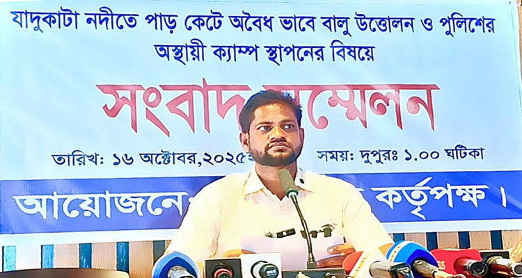 সুনামগঞ্জের তাহিরপুর উপজেলার যাদুকাটা নদীতে পাড় কেটে অবৈধভাবে বালু উত্তোলন ও পুলিশের অস্থায়ী ক্যাম্প স্থাপনের বিষয়ে সংবাদ সম্মেলন অনুষ্ঠিত হয়েছে।