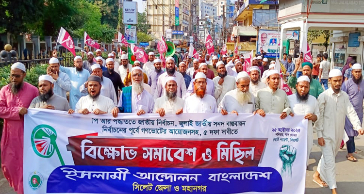 পিআর পদ্ধতিতে জাতীয় নির্বাচন, জুলাই জাতীয় সনদ বাস্তবায়ন ও নির্বাচনের পূর্বে গণভোটের আয়োজন ৫ দফা দাবি আদায়ে ইসলামী আন্দোলন বাংলাদেশ সিলেট জেলা ও মহানগরের উদ্যোগে শনিবার (২৫ অক্টোবর) বাদ জুহর নগরীর কোর্ট পয়েন্টে থেকে বিশাল বিক্ষাভ মিছিল শুরু করে সিলেট চৌহ্রাটা পয়েন্টে গিয়ে শেষ হয়।