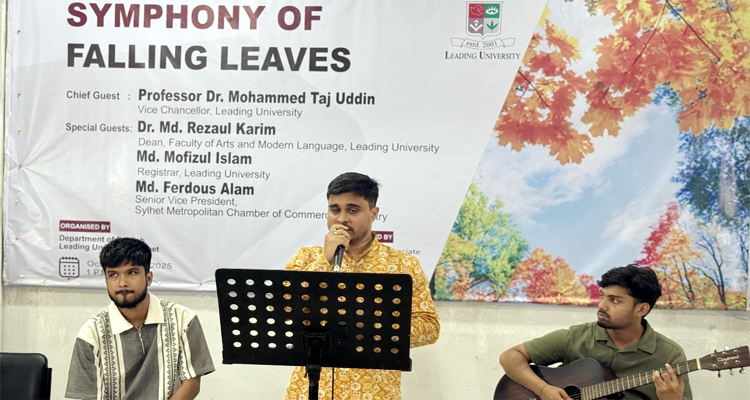 লিডিং ইউনিভার্সিটির ইংরেজি বিভাগের আয়োজনে সাংস্কৃতিক অনুষ্ঠান ‘ঝরে পড়া পাতার ঐকতান’ অনুষ্ঠিত হয়েছে। সোমবার (২৭ অক্টোবর) বেলা ১টায় বিশ্ববিদ্যালয়ের গ্যালারি-১ এ শিক্ষার্থীদের অংশগ্রহণে ‘Symphony of falling leaves’-শীর্ষক কালচারাল প্রোগ্রাম অনুষ্ঠিত হয়েছে।