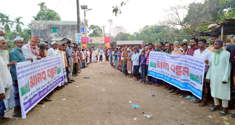 মিথ্যা ধর্ষণ চেষ্টা মামলা প্রত্যাহার ও ফসলের ক্ষতিপূরণের দাবিতে মানববন্ধন