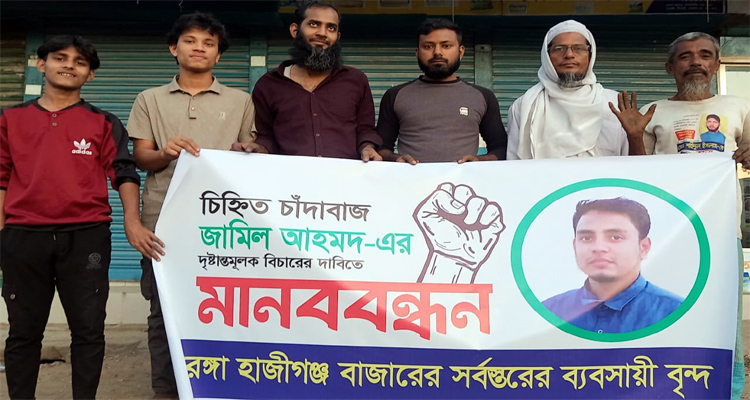মানববন্ধনে বক্তারা বলেন, মোগরাবাজার থানার হরিনাথপুর গ্রামের মশাহিদ আলী ছেলে জামিল আহমদ বিভিন্ন পরিচয়ে সন্ত্রাসী কর্মকান্ডে চাঁদাবাজি করছে। নিরীহ মানুষের জমি দখল, ঘরবাড়ি ভাঙচুর, মাদক ব্যবসা, চাঁদাবাজি এবং সন্ত্রাসী কর্মকাণ্ডে তিনি জড়িত। সে বিভিন্ন প্রতিষ্ঠানে বিভিন্নভাবে একের এক চাঁদাবাজি করে আসছে। গত ০২ জুন ২০২৪ তারিখ রাত ৮টায় রেঙ্গা হাজিগঞ্জ বাজারে গিয়ে জামিল সহ ২ জন আসামী মোটরসাইকেল যোগে গিয়ে চাকু গলা ধরে হত্যার ভয় দেখিয়ে তানহা ভেরাইটিজ স্টোরে স্বত্বাধিকারী তুহিন আহমদের নিকট ৫ লক্ষ টাকা চাঁদা দাবি করে। তিনি চাঁদা দিতে অপারগতা প্রকাশ করলে তাকে কিল ঘুষি মেরে তাকে গুরুতর আহত করে। আশপাশের লোকজন এগিয়ে আসলে চাঁদাবাজরা তাকে হত্যা করে লাশ গুম করে ফেলার হুমকি দিয়ে চলে যায়। তাদের অত্যাচারে এলাকার সাধারণ মানুষ ও ব্যবসায়ীরা অতিষ্ঠ। চাঁদা না দিলে তারা মামলায় জড়ানোর ভয় দেখায় ও সামাজিক যোগাযোগমাধ্যমে অপপ্রচার চালায়। বক্তারা আইনের আওতায় এনে জামিল আহমদকে দৃষ্টান্তমূলক শাস্তির জোর দাবি জানান। অন্যথায় বক্তারা এলাকায় একের পর এক চাঁদাবাজ জামিলের বিরুদ্ধে আন্দোলন চালিয়ে যাবে।