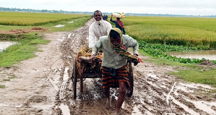সুনামগঞ্জে কৃষকের ধান কাটার আনন্দ ম্লান যাতায়াতের দুর্ভোগে