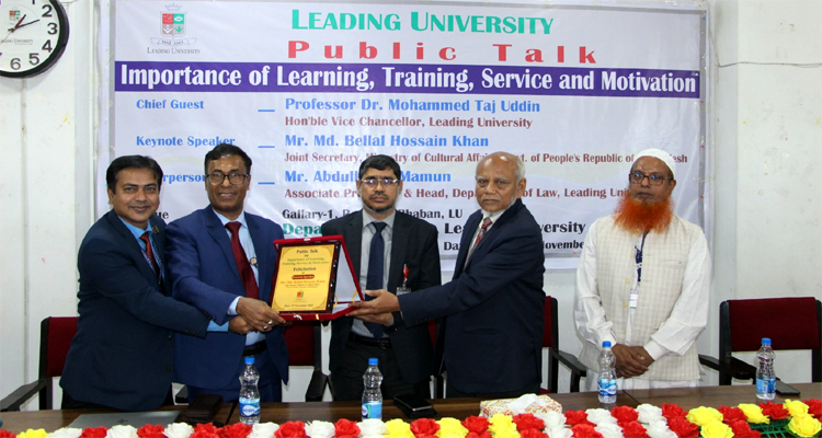 লিডিং ইউনিভার্সিটির আইন বিভাগের উদ্যোগে পাবলিক টক অনুষ্ঠিত হয়েছে। বৃহস্পতিবার (২৭ নভেম্বর) বিশ্ববিদ্যালয়ের গ্যালারী-১ এ ‘Importance of Learning, Training, Service and Motivation’ শীর্ষক পাবলিক টক অনুষ্ঠানে প্রধান অতিথি হিসেবে লিডিং ইউনিভার্সিটির উপাচার্য প্রফেসর ড. মোহাম্মদ তাজ উদ্দিন এবং এতে কীনোট স্পিকার হিসেবে গণপ্রজাতন্ত্রী বাংলাদেশ সরকারের সাংস্কৃতিক বিষয়ক মন্ত্রণালয়ের যুগ্ম সচিব মো. বেল্লাল হোসেন খান উপস্থিত ছিলেন।